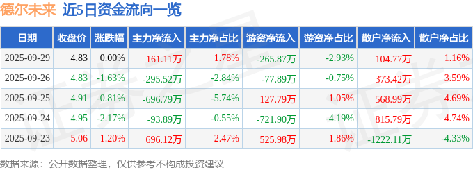 证券之星消息,截至2025年9月29日收盘,德尔未来(002631)报收于4.83元,上涨0.0%,换手率2.38%,成交量18.92万手,成交额9068.19万元。
