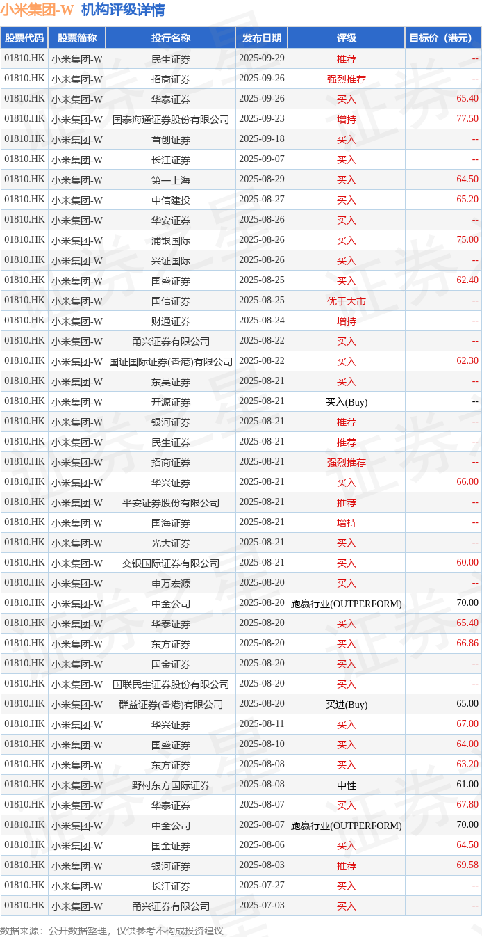 投行对该股的评级以买入为主,近90天内共有27家投行给出买入评级,近90天的目标均价为66.32港元。民生证券最新一份研报给予小米集团-W推荐评级。
