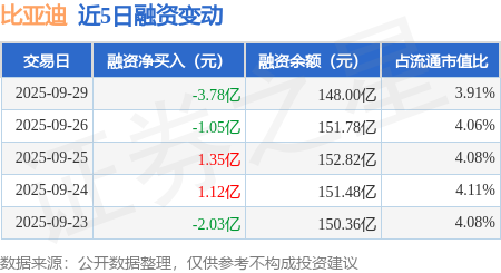 证券之星消息,9月29日,比亚迪(002594)融资买入7.79亿元,融资偿还11.57亿元,融资净卖出3.78亿元,融资余额148.0亿元。