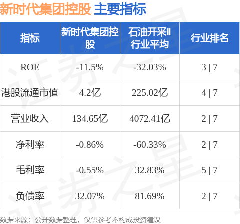 新时代集团控股港股市值4.2亿港元,在石油开采Ⅱ行业中排名第4。主要指标见下表: