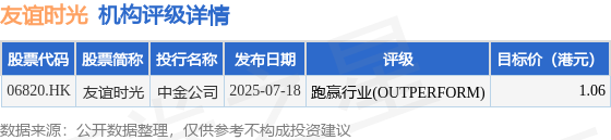 截至2025年9月30日收盘,友谊时光(06820.HK)报收于0.6港元,与上一交易日持平,成交量306.2万股,成交额181.71万港元。投行对该股的评级以跑赢行业(OUTPERFORM)为主,近90天内共有1家投行给出跑赢行业(OUTPERFORM)评级,近90天的目标均价为1.06港元。中金公司最新一份研报给予友谊时光跑赢行业(OUTPERFORM)评级,目标价1.06港元。