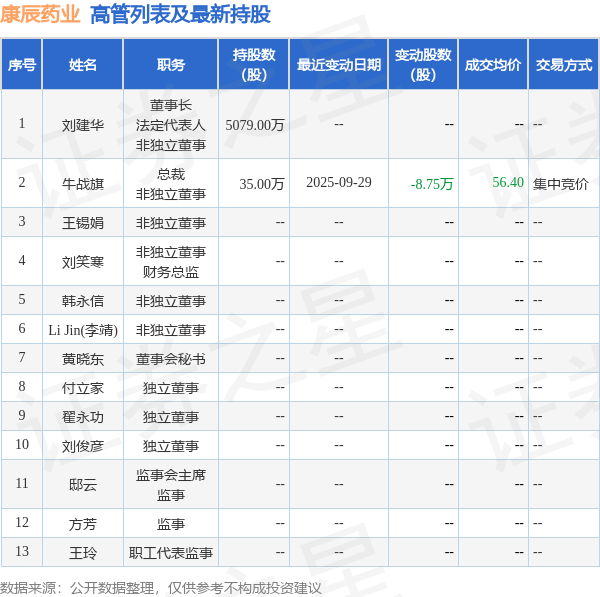 康辰药业的高管列表及最新持股情况如下: