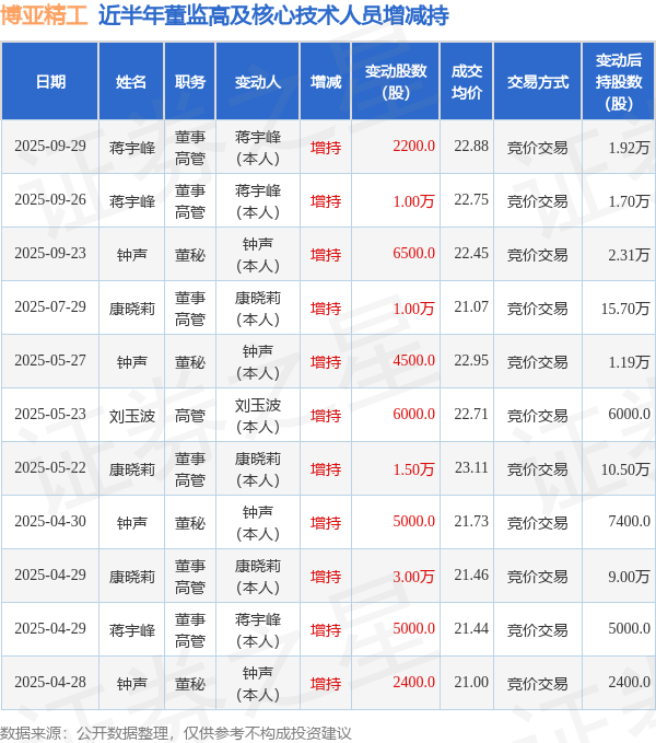 博亚精工近半年内的董监高及核心技术人员增减持详情如下: