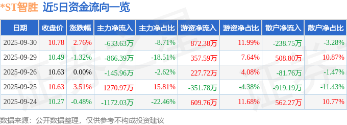 证券之星消息,截至2025年9月30日收盘,*ST智胜(002253)报收于10.78元,上涨2.76%,换手率3.23%,成交量6.72万手,成交额7273.14万元。