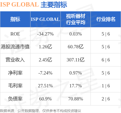 ISP GLOBAL港股市值1.26亿港元,在视听器材行业中排名第5。主要指标见下表: