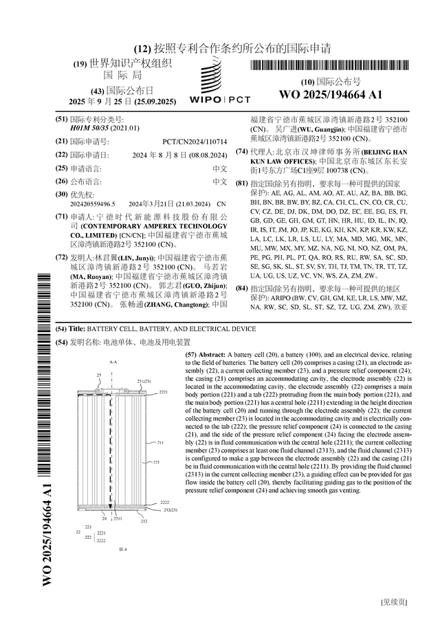证券之星消息,根据企查查数据显示宁德时代(300750)公布了一项国际专利申请,专利名为“电池单体、电池及用电装置”,专利申请号为PCT/CN2024/110714,国际公布日为2025年9月25日。