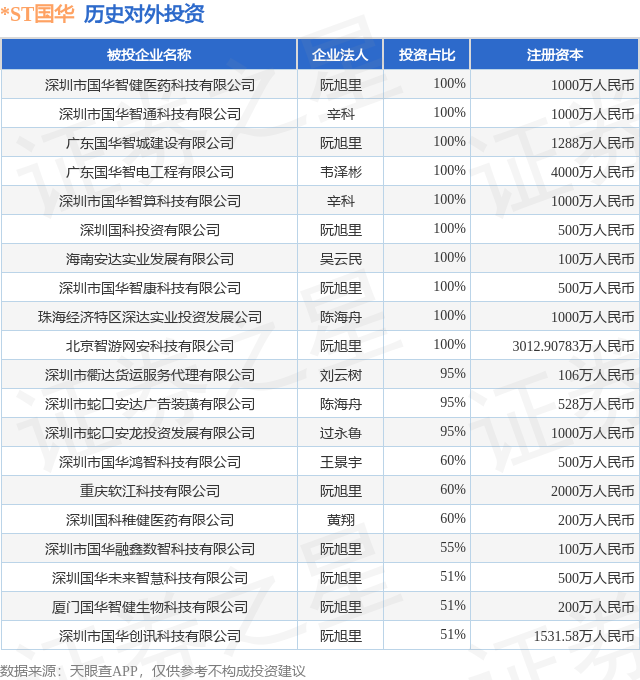证券之星消息,根据天眼查APP显示,*ST国华(000004.SZ)新增一起对外投资事件,被投资公司为重庆软江科技有限公司,法定代表人阮旭里,投资占比为60%。该公司从事软件和信息技术服务业,注册资本为2000万人民币。目前,*ST国华共存在对外投资28项,投资占比前20的项目见下表: