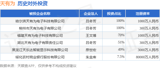 通过天眼查大数据分析,黑龙江天有为电子股份有限公司共对外投资了5家企业,参与招投标项目41次;财产线索方面有商标信息13条,专利信息206条,著作权信息30条;此外企业还拥有行政许可58个。据2024年报数据,天有为长期股权投资1293.53万元,同比增89.22%。