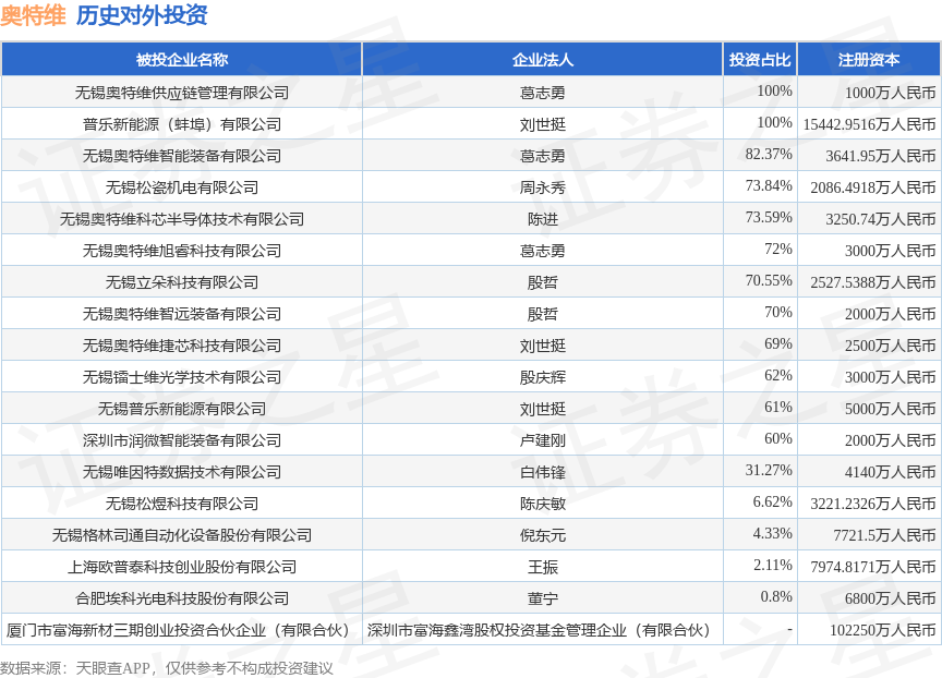 证券之星消息,根据天眼查APP显示,奥特维(688516.SH)新增一起对外投资事件,被投资公司为深圳市润微智能装备有限公司,法定代表人卢建刚,投资占比为60%。该公司从事其他制造业,注册资本为2000万人民币。目前,奥特维共存在对外投资18项,详见下表: