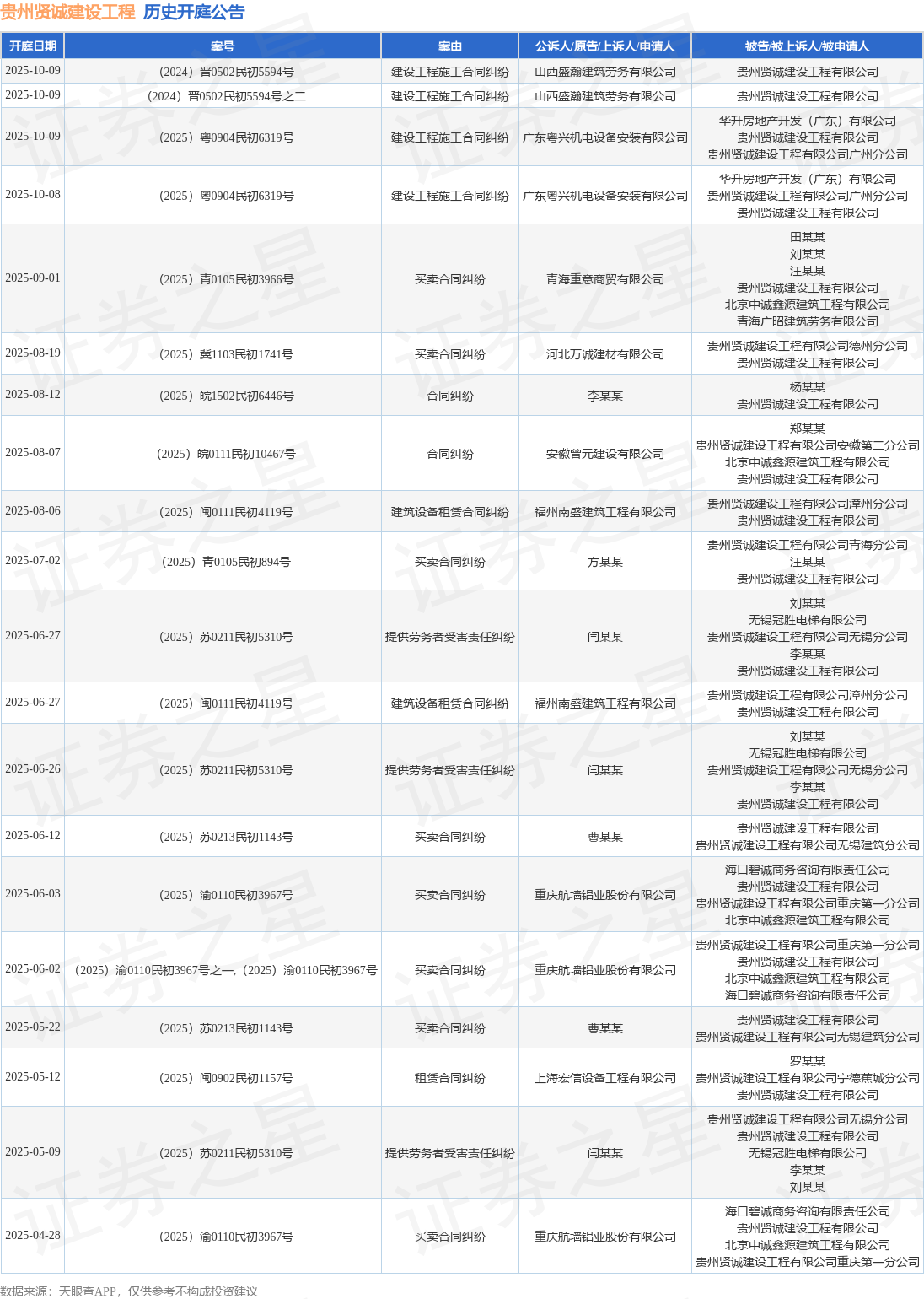 案号:(2025)粤0904民初6319号根据统计,近一年内以贵州贤诚建设工程有限公司为当事人的历史开庭公告有36则,其中案由为“买卖合同纠纷”的公告以11则居首,其次为“建设工程施工合同纠纷”有8则,“合同纠纷”有3则。历史开庭公告(前20条)如下: