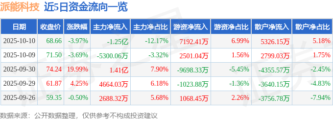 证券之星消息,截至2025年10月10日收盘,派能科技(688063)报收于68.66元,下跌3.97%,换手率6.0%,成交量14.73万手,成交额10.29亿元。