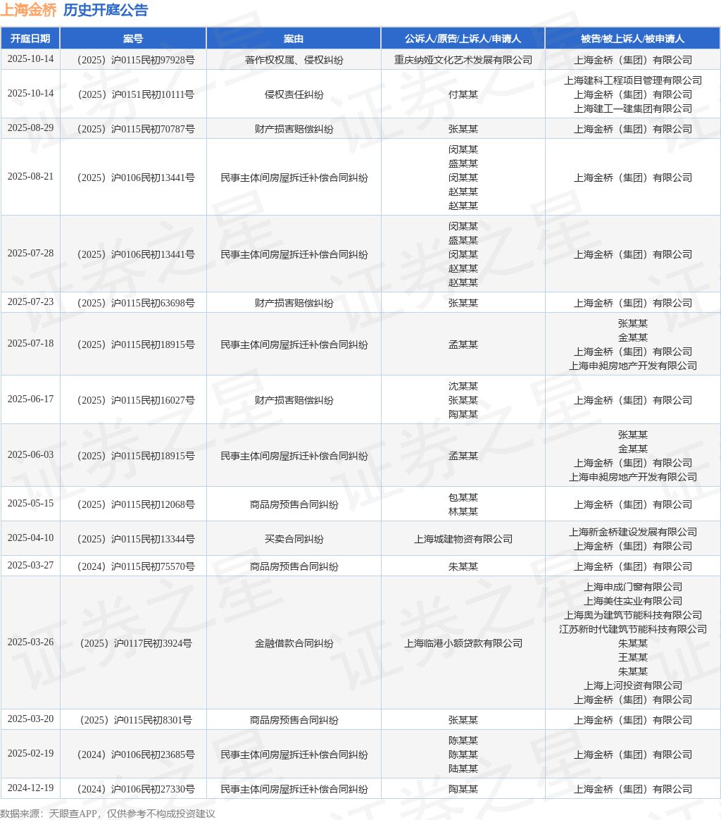 案号:(2025)沪0151民初10111号根据统计,近一年内以上海金桥(集团)有限公司为当事人的历史开庭公告有16则,其中案由为“民事主体间房屋拆迁补偿合同纠纷”的公告以6则居首,其次为“商品房预售合同纠纷”有3则,“财产损害赔偿纠纷”有3则。历史开庭公告如下: