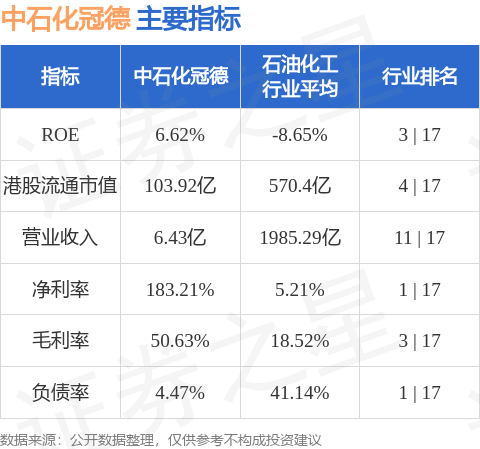 中石化冠德港股市值103.92亿港元,在石油化工行业中排名第4。主要指标见下表: