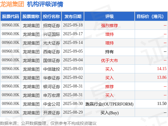 截至2025年10月13日收盘,龙湖集团(00960.HK)报收于10.56港元,下跌0.47%,成交量3490.95万股,成交额3.66亿港元。投行对该股的评级以买入为主,近90天内共有3家投行给出买入评级,近90天的目标均价为13.17港元。招商证券最新一份研报给予龙湖集团强烈推荐评级。