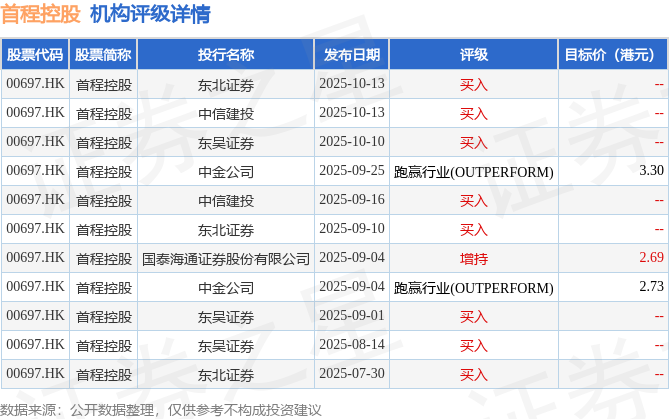截至2025年10月13日收盘,首程控股(00697.HK)报收于2.27港元,下跌0.87%,成交量9150.16万股,成交额2.05亿港元。投行对该股的评级以买入为主,近90天内共有8家投行给出买入评级,近90天的目标均价为2.91港元。东北证券最新一份研报给予首程控股买入评级。