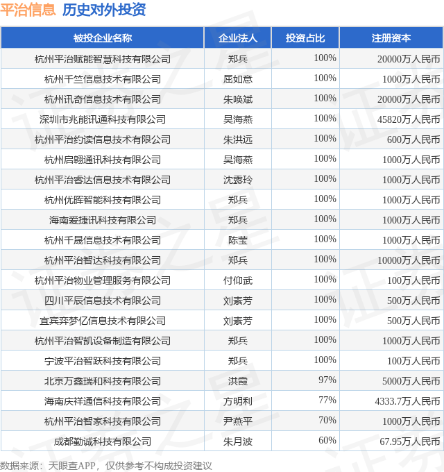 通过天眼查大数据分析,杭州平治信息技术股份有限公司共对外投资了53家企业,参与招投标项目85次;财产线索方面有商标信息65条,专利信息95条,著作权信息77条;此外企业还拥有行政许可26个。据2024年报数据,平治信息商誉1754.94万元,同比减33.78%。长期股权投资6737.91万元,同比减22.83%。