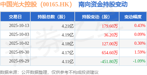 证券之星消息,10月13日南向资金增持179.6万股中国光大控股(00165.HK)。近5个交易日中,获南向资金增持的有4天,累计净增持545.6万股。近20个交易日中,获南向资金减持的有12天,累计净减持1327.4万股。截至目前,南向资金持有中国光大控股(00165.HK)4.21亿股,占公司已发行普通股的24.95%。