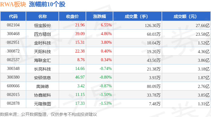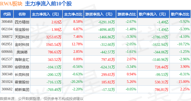从资金流向上来看,当日RWA板块主力资金净流入2.17亿元,游资资金净流出6857.27万元,散户资金净流出1.49亿元。RWA板块个股资金流向见下表: