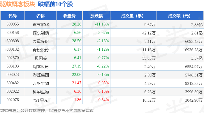 证券之星消息,10月14日驱蚊概念板块较上一交易日上涨0.63%,上海家化领涨。当日上证指数报收于3865.23,下跌0.62%。深证成指报收于12895.11,下跌2.54%。驱蚊概念板块个股涨跌见下表: