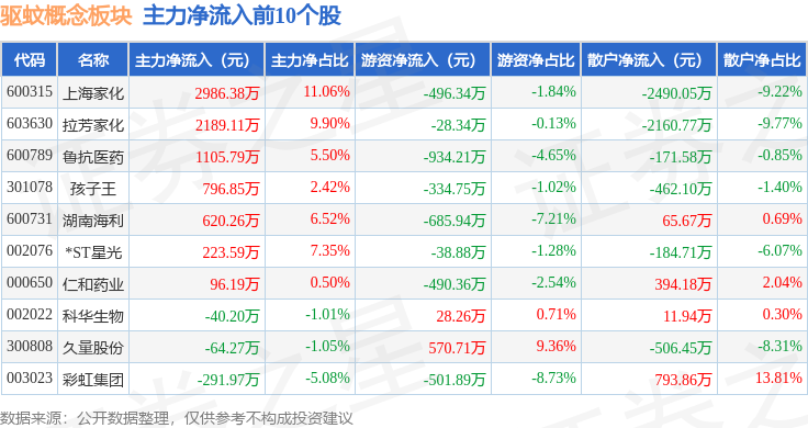 从资金流向上来看,当日驱蚊概念板块主力资金净流入290.63万元,游资资金净流出2031.21万元,散户资金净流入1740.58万元。驱蚊概念板块个股资金流向见下表: