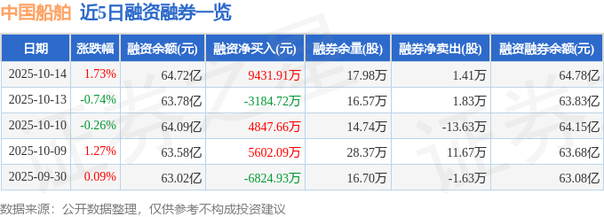 中国船舶融资融券信息显示,融资方面,当日融资买入5.07亿元,融资偿还4.12亿元,融资净买入9431.91万元。融券方面,融券卖出1.89万股,融券偿还4800.0股,融券余量17.98万股,融券余额634.51万元。融资融券余额64.78亿元。