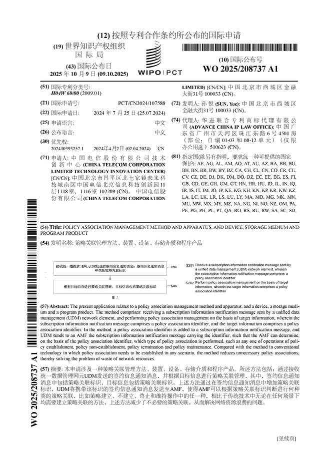 证券之星消息,根据企查查数据显示中国电信(601728)公布了一项国际专利申请,专利名为“策略关联管理方法、装置、设备、存储介质和程序产品”,专利申请号为PCT/CN2024/107588,国际公布日为2025年10月9日。