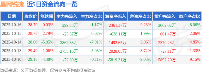 证券之星消息,截至2025年10月16日收盘,星网锐捷(002396)报收于28.79元,上涨0.03%,换手率1.52%,成交量8.85万手,成交额2.56亿元。