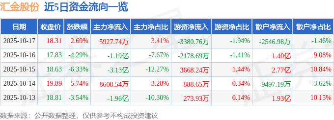 证券之星消息,截至2025年10月17日收盘,汇金股份(300368)报收于18.31元,上涨2.69%,换手率17.74%,成交量93.84万手,成交额17.4亿元。