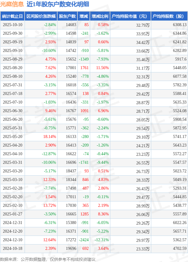 从股价来看,2025年9月30日至2025年10月10日,光庭信息区间跌幅为2.84%,在此期间股东户数增加85.0户,增幅为0.58%。