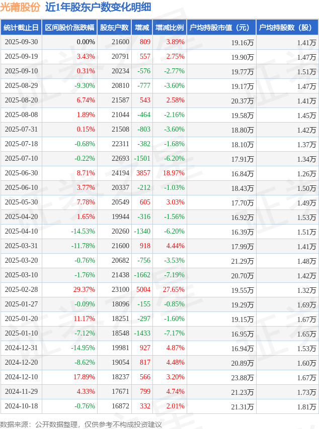 从股价来看,2025年9月19日至2025年9月30日,光莆股份区间跌幅为0.0%,在此期间股东户数增加809.0户,增幅为3.89%。