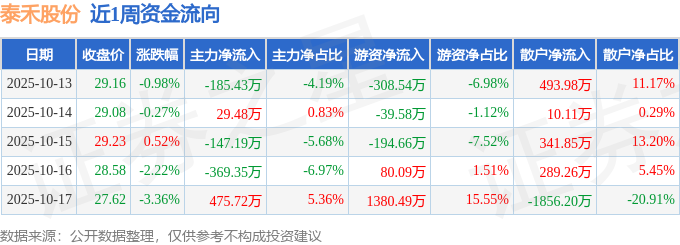 资金流向数据方面,本周泰禾股份主力资金合计净流出196.78万元,游资资金合计净流入917.79万元,散户资金合计净流出721.01万元。本周资金流向一览见下表: