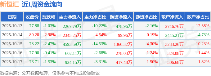 资金流向数据方面,本周新恒汇主力资金合计净流出6042.39万元,游资资金合计净流入1676.83万元,散户资金合计净流入4365.56万元。本周资金流向一览见下表: