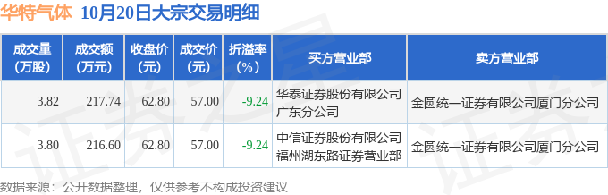 证券之星消息,10月20日华特气体发生大宗交易,交易数据如下: