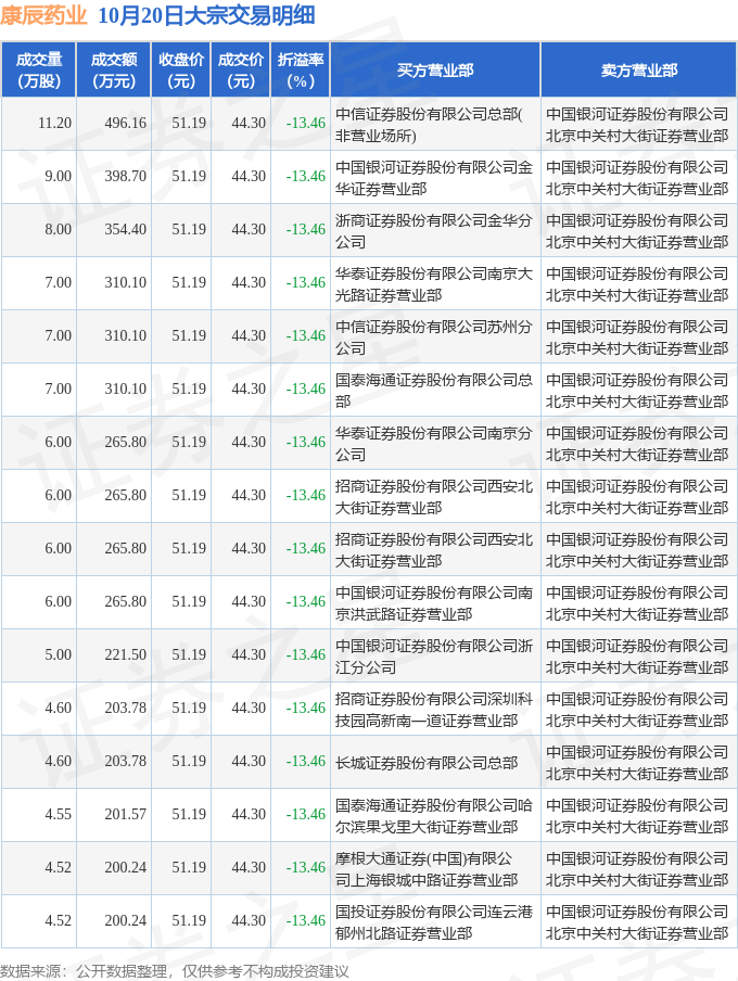证券之星消息,10月20日康辰药业发生大宗交易,交易数据如下: