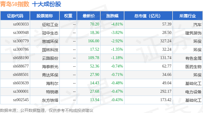 青岛50(989011)指数十大成份股详情如下: