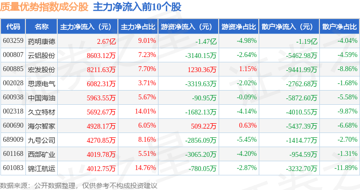 资金流向方面,质量优势(989017)指数成份股当日主力资金净流出合计11.88亿元,游资资金净流出合计3893.53万元,散户资金净流入合计12.27亿元。成份股资金流向详情见下表: