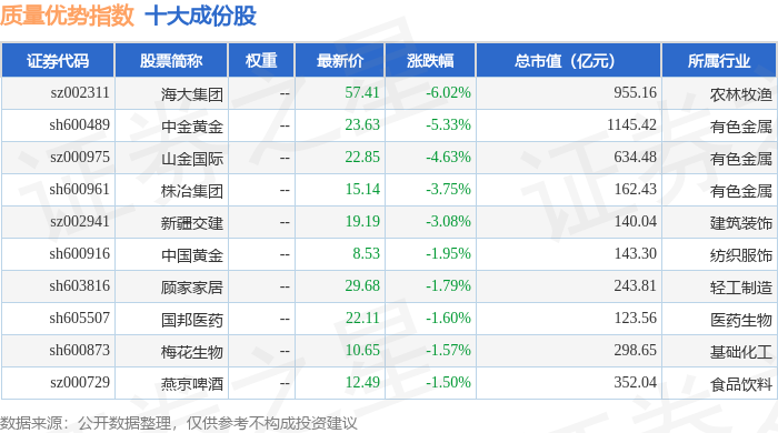 证券之星消息,10月20日,质量优势(989017)指数报收于7877.56点,跌0.01%,成交617.07亿元,换手率0.93%。当日该指数成份股中,上涨的有53家,安通控股以10.05%的涨幅领涨,下跌的有44家,海大集团以6.02%的跌幅领跌。