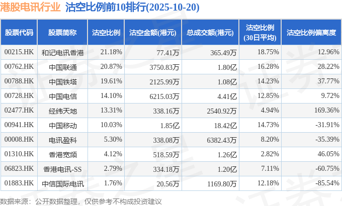 从沽空比例来看,和记电讯香港、中国联通、中国铁塔沽空比例位居行业前三,分别为21.18%、20.87%、19.61%。