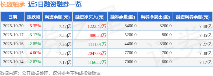 长盛轴承融资融券信息显示,融资方面,当日融资买入8760.88万元,融资偿还7537.46万元,融资净买入1223.42万元。融券方面,融券卖出4500.0股,融券偿还1300.0股,融券余量8400.0股,融券余额72.14万元。融资融券余额7.48亿元。
