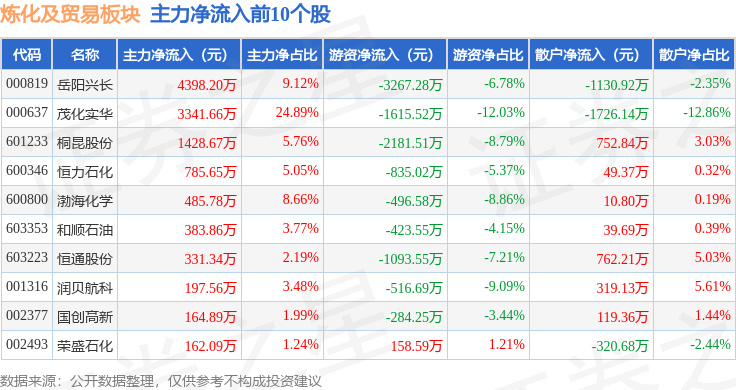 从资金流向上来看,当日炼化及贸易板块主力资金净流出1.62亿元,游资资金净流出1.29亿元,散户资金净流入2.91亿元。炼化及贸易板块个股资金流向见下表: