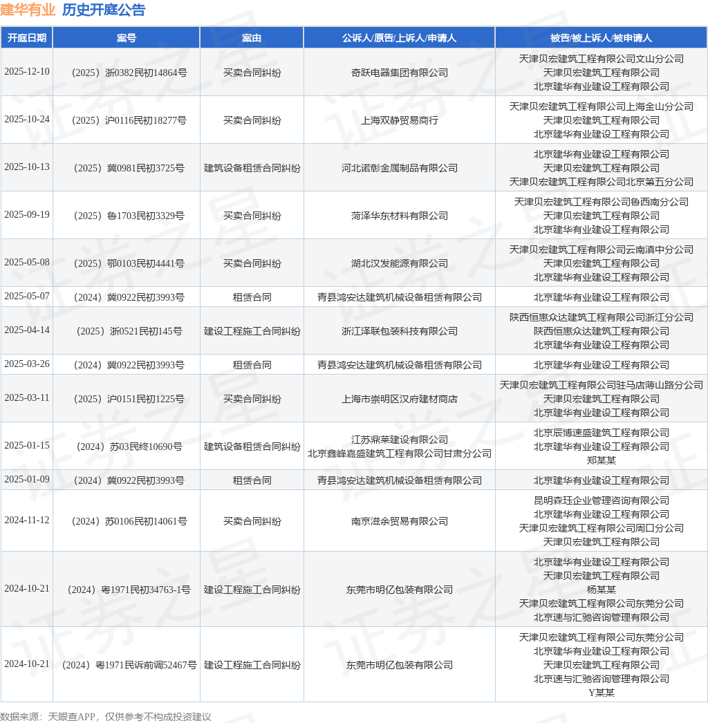 案号:(2025)沪0116民初18277号根据统计,近一年内以北京建华有业建设工程有限公司为当事人的历史开庭公告有14则,其中案由为“买卖合同纠纷”的公告以6则居首,其次为“建设工程施工合同纠纷”有3则,“租赁合同”有3则。历史开庭公告如下:
