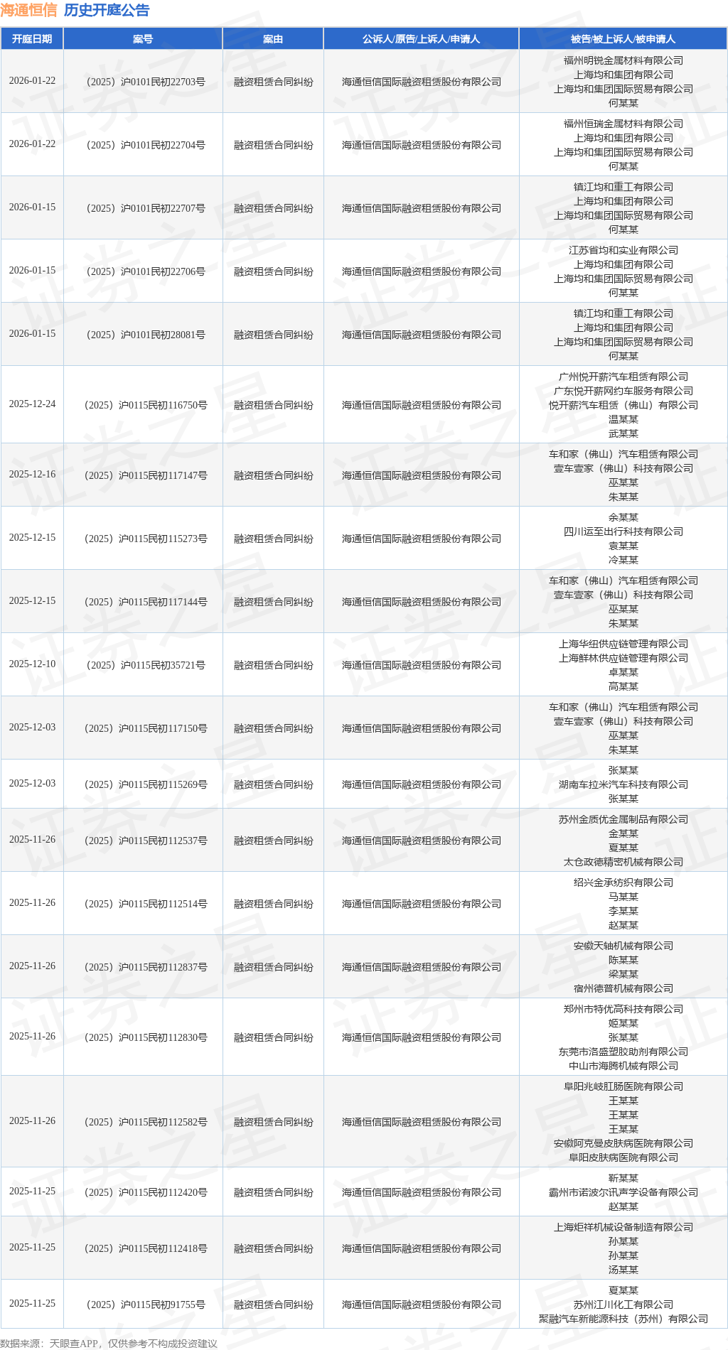 案号:(2025)沪0101民初8047号根据统计,近一年内以海通恒信国际融资租赁股份有限公司为当事人的历史开庭公告有1524则,其中案由为“融资租赁合同纠纷”的公告以1392则居首,其次为“申请实现担保物权”有54则,“合同纠纷”有18则。历史开庭公告(前20条)如下: