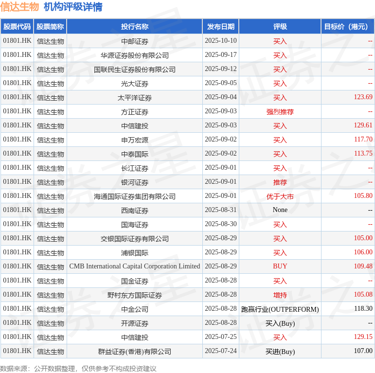 投行对该股的评级以买入为主,近90天内共有14家投行给出买入评级,近90天的目标均价为114.21港元。中邮证券最新一份研报给予信达生物买入评级。