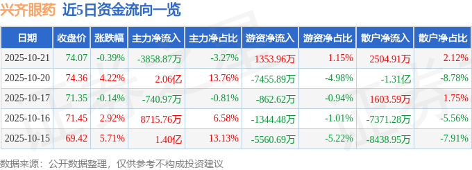 证券之星消息,截至2025年10月21日收盘,兴齐眼药(300573)报收于74.07元,下跌0.39%,换手率8.42%,成交量15.87万手,成交额11.8亿元。