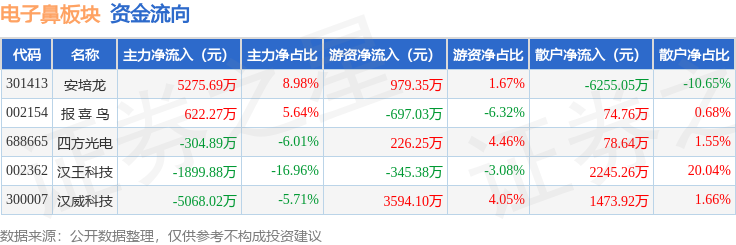 从资金流向上来看,当日电子鼻板块主力资金净流出1374.82万元,游资资金净流入3757.29万元,散户资金净流出2382.47万元。电子鼻板块个股资金流向见下表: