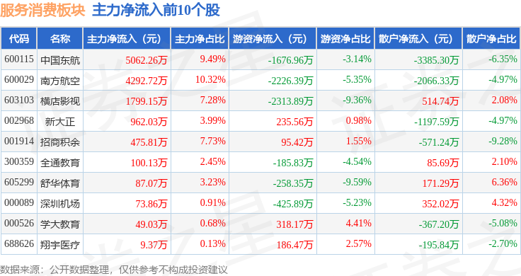 从资金流向上来看,当日服务消费板块主力资金净流出3.08亿元,游资资金净流出3802.95万元,散户资金净流入3.46亿元。服务消费板块个股资金流向见下表:
