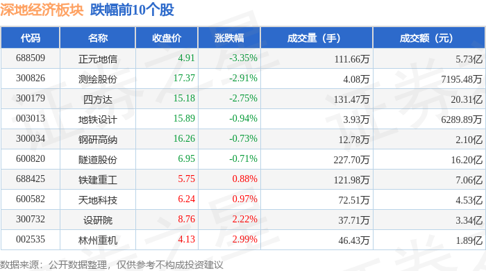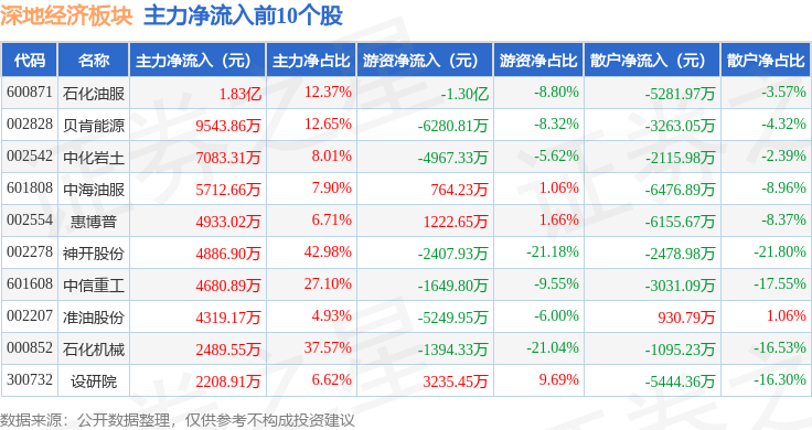 从资金流向上来看,当日深地经济板块主力资金净流出2.99亿元,游资资金净流入1731.87万元,散户资金净流入2.82亿元。深地经济板块个股资金流向见下表: