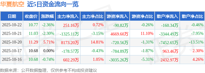 证券之星消息,截至2025年10月22日收盘,华夏航空(002928)报收于10.77元,下跌2.36%,换手率2.56%,成交量32.74万手,成交额3.51亿元。