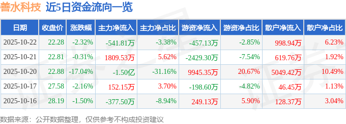 证券之星消息,截至2025年10月22日收盘,善水科技(301190)报收于22.28元,下跌2.32%,换手率4.48%,成交量7.14万手,成交额1.6亿元。