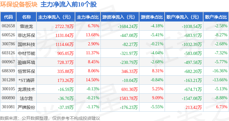 从资金流向上来看,当日环保设备板块主力资金净流出7001.57万元,游资资金净流入2334.56万元,散户资金净流入4667.0万元。环保设备板块个股资金流向见下表: